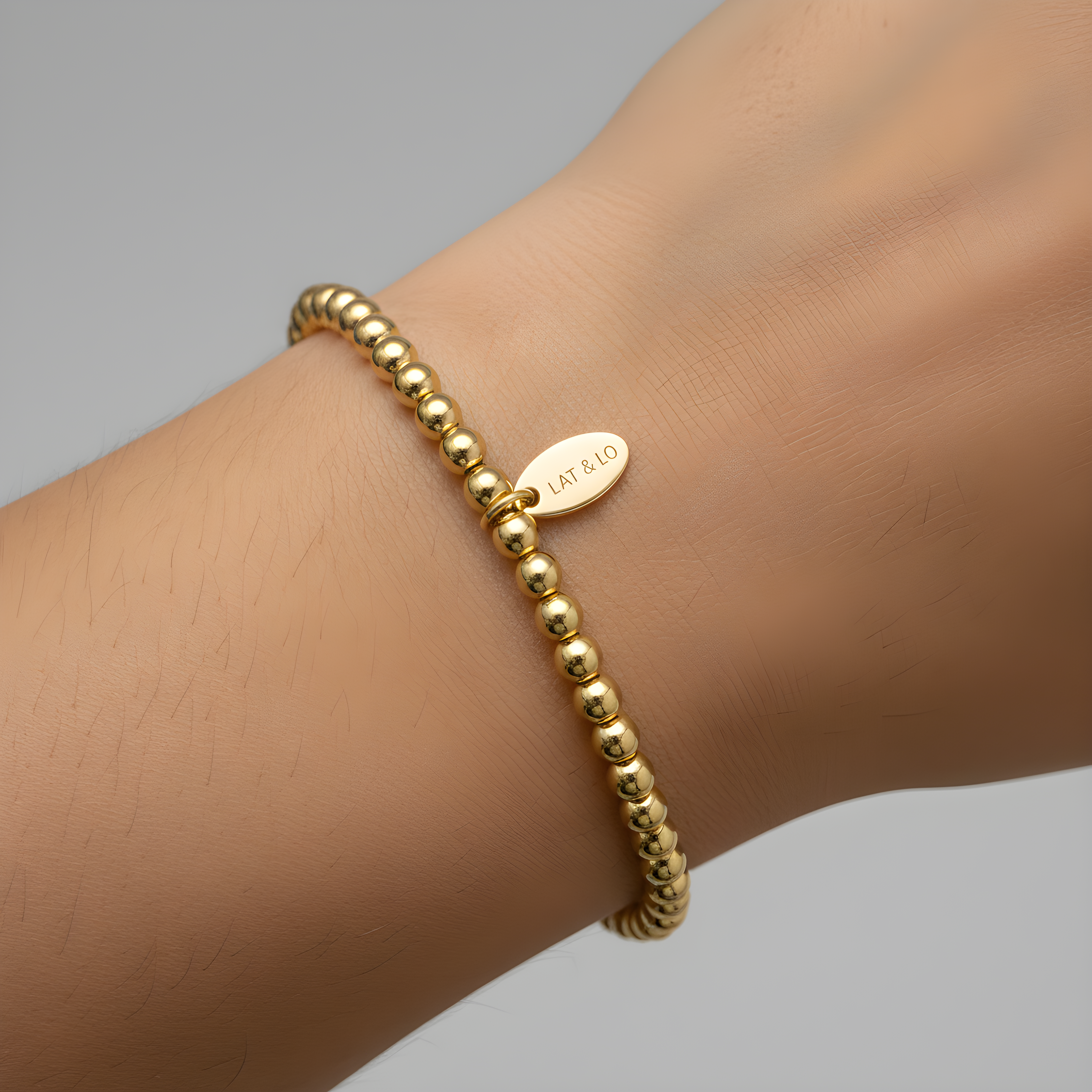 This elegant 4mm beaded bracelet combines timeless sophistication with everyday versatility. Crafted from 14K gold-filled beads, it offers a luxurious feel without the weight. The stretchy design accommodates wrists up to approximately 6.5 inches and pairs beautifully when layered with complementary pieces. A signature logo tag provides the option for personalized engraving on one side—add your name or a meaningful word to make it uniquely yours. Limited availability.
