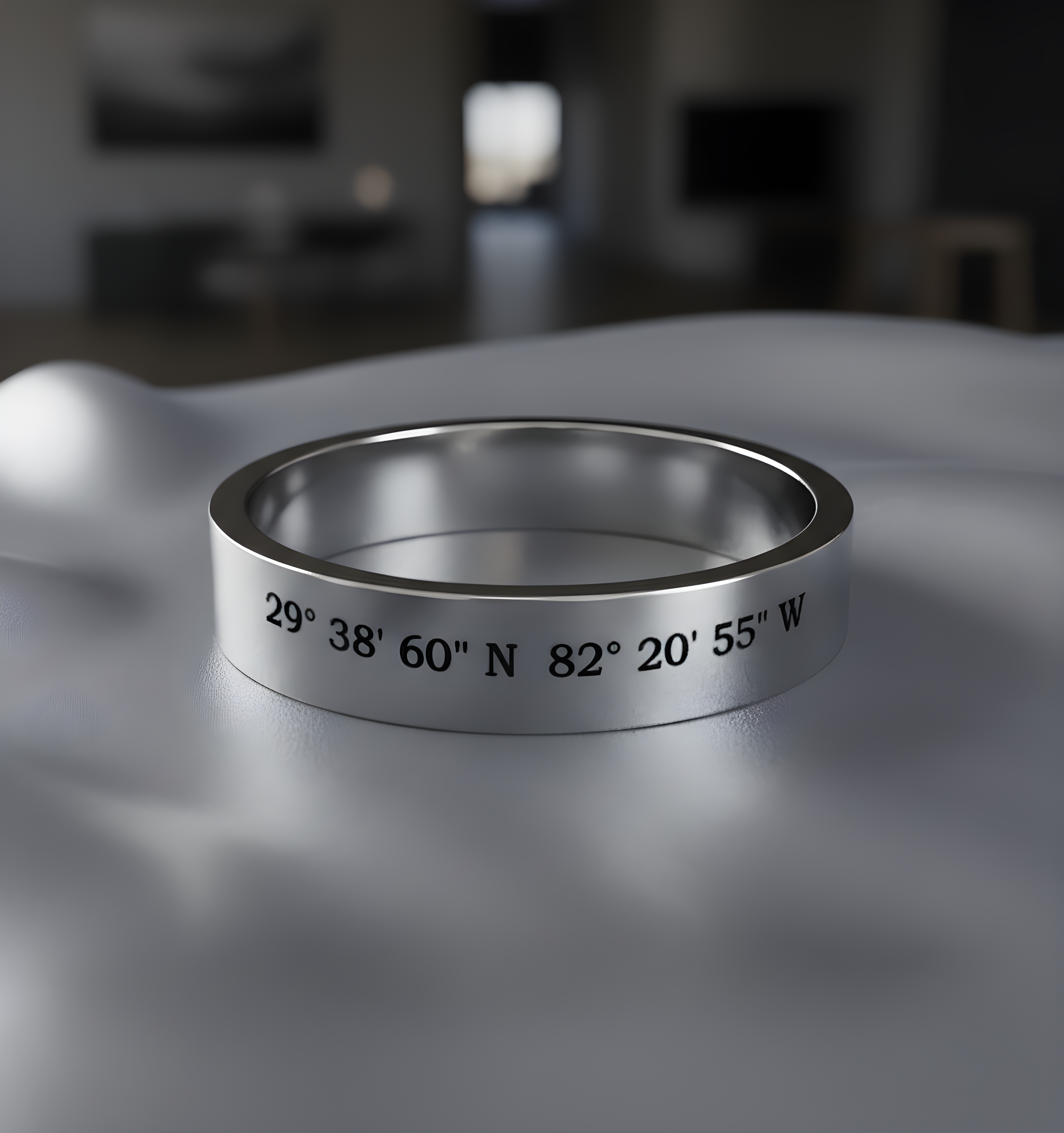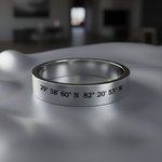 This 4mm wide flat band is engraved with the latitude and longitude of your meaningful location or custom text that tells your story. Crafted from solid sterling silver, it offers a timeless, understated look designed for everyday wear.
