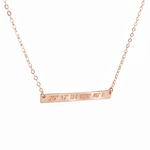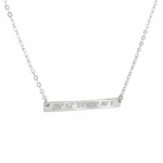 Celebrate a meaningful location with this elegant skinny bar necklace, engraved with the precise coordinates of your chosen place. Crafted for subtle sophistication, it rests gracefully on a fine cable chain that adds a refined touch to any outfit. This personalized piece not only serves as a stylish accessory but also holds a sentimental value, making it a timeless keepsake to cherish every day.