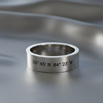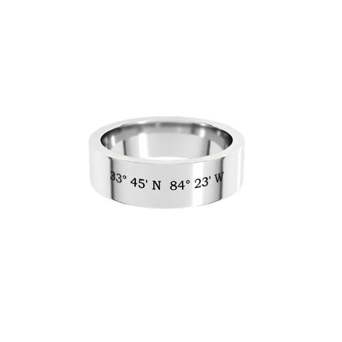 This 6mm wide flat band is engraved with the latitude and longitude of your meaningful location or custom text that tells your story. Crafted from solid sterling silver, it offers a timeless, understated look designed for everyday wear.